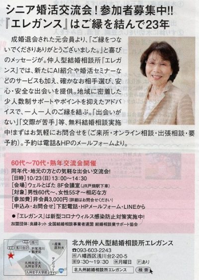 シニア婚活をもっと身近に!もっと気軽に!! 同世代の方との気軽な出会い交流会です! 婚活を始めたい方・・・ 自分から出会いの場へ出かけましょう!! じっとしていても出会いは向こうからやってきません・・・ 「パートナー探し」結婚相談所エレガンスがお手伝いを致します。 ※お申し込みを締め切らせて頂きました!! ※交流会は「ミニお見合い会」に変更、無料結婚相談会、終了いたしました。 ご参加頂きまして・・・