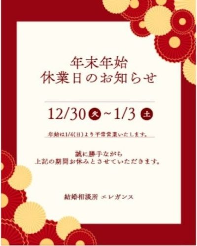 結婚相談所エレガンスより 年末年始休業のお知らせ、です。 令和7年12月30日(火)~令和8年1月3日(土)迄休業いたします。 1月4日(日)より平常通り営業いたします。 今年も、結婚相談所エレガンスのHPをご覧いただきまして 有難うございました。 お問合せ、ご相談を頂きまして有難うございます。 くる年も どうぞ宜しくお願い申しあげます。 結婚相談はいつでも無料で承って・・・